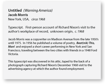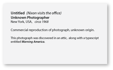 In late 1968 Richard Nixon walked into an advertising agency in New York and requested a campaign that had the look of Socialist Realist propaganda. When asked what he was selling, the President-elect answered, “Our New Friends, China.” Foreign policy was at the forefront of the new administration’s agenda. The United States stood face to face with China on the ground in Southeast Asia. Nixon planned to wrap up the Vietnam conflict quickly, and lure China into a cozy relationship based on trade. Nixon felt that American capitalism combined with Chinese markets would lift both nations, and ensure America’s prosperity for the next century. Based on an interview with Nixon and his team, the agency art department designed collateral materials and shared them with Mr. Nixon during several meetings held in December of that year. But The PLA Campaign, as it came to be known, never made it past the initial stage, and vanished from the collective memory until the discovery of a photograph of Nixon visiting the agency re-opened the window on this corner of history. The photograph, unearthed in an attic, also revealed a typescript, entitled "Warning America," attached to the back of the frame. The discovery of these items lead to subsequent investigation of Nixon's visit, and brought to light additional lost ephemera along with insight into the foreign and domestic policy agendas of one of America's most import historical figures.